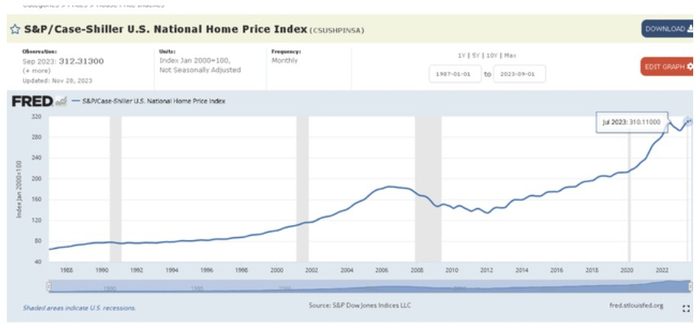 由于经济衰退的威胁,美国房价在2022年开始下跌,并在2023年第一季度触底。然而,由于经济衰退从未发生,现在美国的两收入家庭成为常态,消费者信心十足,我们可以再次看到房价上涨。此外,消费者现在正在寻找新的现代住宅,这是有限的供应。我预计房价将继续上涨,2024年可能会上涨5%左右。