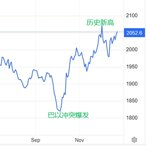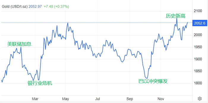第四季度巴以之间爆发了新一轮冲突,随着战争的持续,黄金在整个10月份都在上涨。在地缘政治危机和其他因素的支撑下,金价在12月初飙升至创纪录的2152.30美元。