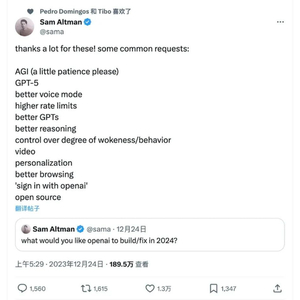这份清单其实起源于12月24日,奥特曼在社交媒体上发布了一条征集帖“你希望OpenAI 在2024年能做到哪些事情?”他的粉丝回复热情很高,奥特曼梳理了一份List(如图片所示),除了在AGI旁边标注了“还需要点耐心”的字样外,其它的愿望清单都没有做任何标注,我们有理由相信,也许奥特曼认为其余目标都有可能在2024年做到。