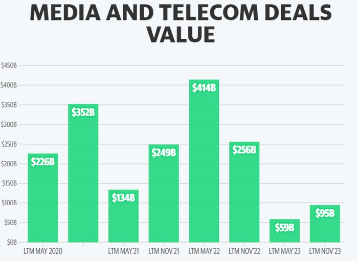 普华永道一年公布两次的美国交易展望显示,媒体和电信行业的交易量和交易额在2023年继续放缓,比去年的跌幅更大。截至11月的过去12个月里,媒体和电信行业共达成2028笔交易,同比下降22%,已宣布的交易价值总计950亿美元,较2022年下降63%。