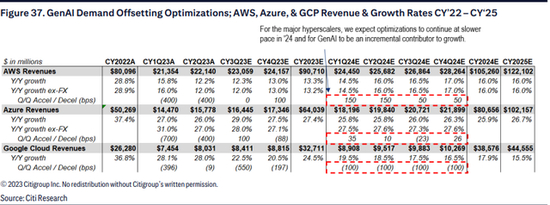 花旗指出,AI将继续赋能云业务发展,整体来看预计“云优化”(资源配置的优化、性能调整、成本控制、安全性提升)将继续,不过GAI将带来需求“顺风”和增量工作负载(新的业务需求或更大规模的数据处理)。而随着优化的减弱和企业从更新的GAI项目的增量支出中受益,云支出增长可能会在2024年适度恢复。