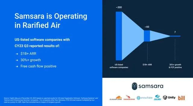 Samsara 是仅有的七家 ARR 超过 10 亿美元的上市软件公司之一,增长率超过 30%,并且在 2023 年 9 月季度末自由现金流 (“FCF”) 为正值。