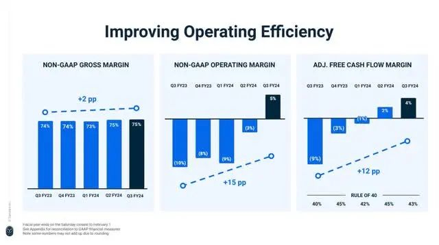 作为一家处于早期阶段的公司,Samsara 强调非 GAAP 指标,其中排除了新公司有时会产生的一次性成本,从而提供了更清晰的盈利轨迹。该公司公布的非公认会计准则营业利润率首次实现盈利,从去年第三季度的负 10% 上升至 5%。第三季度调整后自由现金流利润率为 4%,即 900 万美元,而去年第三季度为负 9%,即亏损 1500 万美元。首席财务官将收益电话会议上的增长归因于“运营杠杆的提高和营运资本的持续改善。 ”