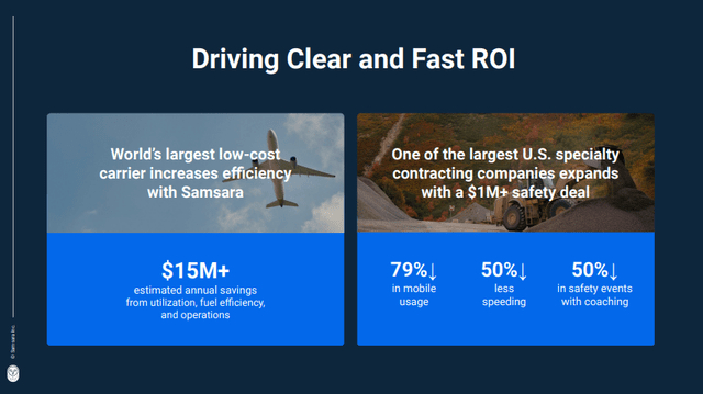 该公司在财报电话会议上举了两个现实生活中的例子,说明它如何为客户带来好处。第一个例子涉及世界上最大的航空公司之一,使用该平台跟踪其在美国主要枢纽的地面设备。第二个例子重点介绍了与美国最大的专业承包公司之一达成的基于视频的安全协议,据 Samsara 称,该协议的重点是“建筑服务、维护、更换、制造和工程服务。 ”下图显示了两家公司的合作方式受益匪浅。
