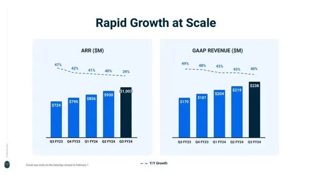 该公司还实现了稳健的收入增长,年度经常性收入(“ARR”)增长率几乎与其收入增长率相匹配,这表明其高收入增长率在短期内很有可能持续下去。Samsara 2024 财年第三季度收入较上年同期增长 40%,达到 2.375 亿美元。同期其 ARR 提高了 39%,达到 10.03 亿美元。更重要的是,ARR 超过 100,000 美元的客户同比增长 49%,达到 1,663 名。该公司首席财务官 Dominic Phillips 也表示:“这是我们连续第三个季度更大规模地加速净新 ARR增长。” Samsara 净新 ARR 增长的持续加速表明,其平台对不断增长的客户群。