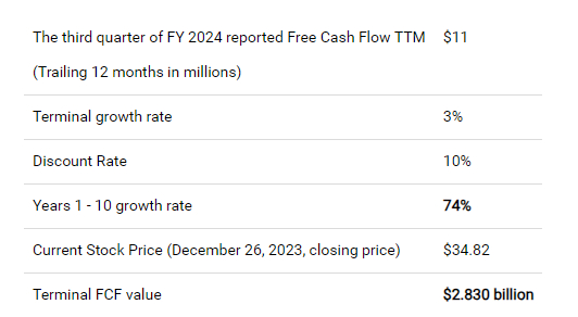按照所有传统的估值指标,市场目前对 Samsara 的估值过高。量化分析师给该公司评级为 D-。让我们看一下反向贴现现金流(“DCF”),看看公司当前股价意味着什么增长。