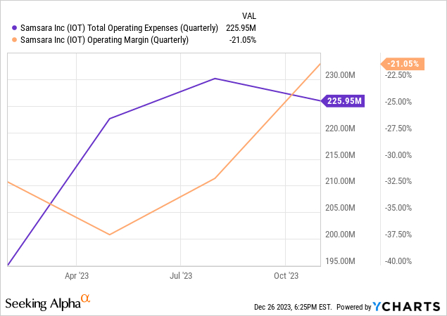 尽管 Samsara 目前尚未按照公认会计原则(“GAAP”)盈利,但一些分析师和投资者认为,在收入增长轨迹以及销售和营销等领域的成本节约努力的支持下,Samsara 未来很有可能实现盈利。一般和管理费用,以及研发方面的一些进一步效率提升。自 2022 年初以来,销售和营销 (S&M)、研发 (R&D) 以及一般和行政 (G&A) 费用占季度收入的百分比持续下降。例如,S&M 和研发费用占季度收入的百分比在 2022 年初超过 90%,但现在到 2023 年第三季度末分别为 49.16% 和 25.60%。2022 年初,G&A 超过 60%,但到 2023 年第三季度末,该比例目前为 20.36%。下图显示,第三季度营业费用绝对值下降,而按公认会计准则计算的营业利润率继续改善。
