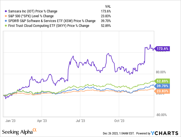 作为市场上增长最快的软件公司之一,Samsara(NYSE:IOT)今年开始吸引投资者的关注。截至 2023 年 12 月 22 日收盘价,市场对该股的报价上涨了 173.6%,大大超过了标准普尔500 指数、软件和云计算市场的回报。