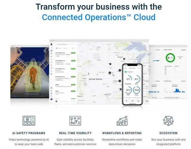基于视频的安全- 公司使用此应用程序来构建最先进的车队安全计划。它由行车记录仪、人工智能驱动的驾驶室内警报系统、虚拟教练系统和手机管理系统组成。该安全应用程序包括驾驶员安全记分卡和风险报告,可以将客户的车队与行业其他车队进行比较。