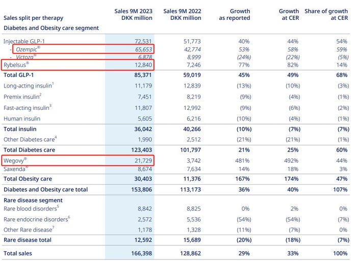 诺和诺德的财报显示,该公司今年前三个季度的销售额累计达1663.98亿丹麦克朗。其中,Ozempic销售额同比增长53%至656.53亿丹麦克朗,Wegovy销售额同比增长481%至217.29亿丹麦克朗,Rybelsus销售额同比增长77%至128.40亿丹麦克朗。这三款司美格鲁肽产品的销售额合计达约1002亿丹麦克朗(约合148亿美元),占该公司整体销售额的逾60%。