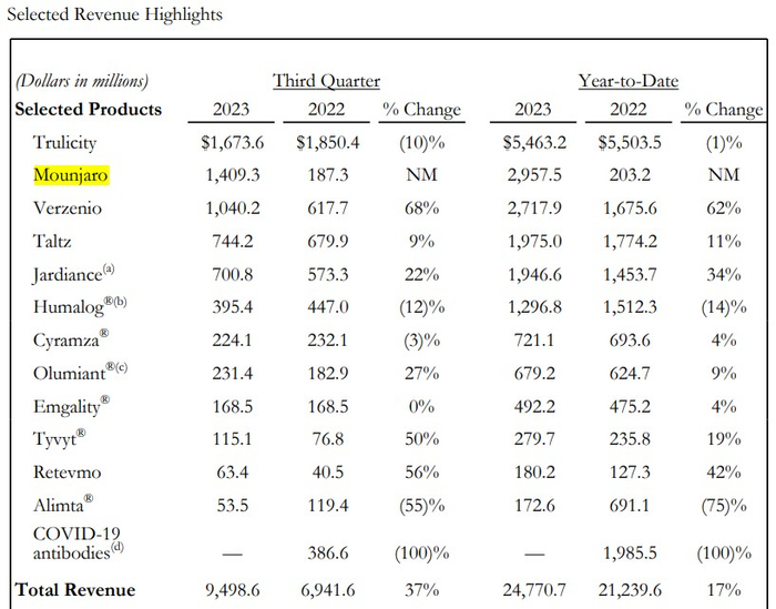 替尔泊肽的减重适应症获批意味着礼来将在减肥领域直接与诺和诺德竞争,并形成分庭抗礼之势。值得一提的是,在替尔泊肽于去年5月获批血糖控制适应症后,由于具有在使用标签外帮助患者减掉多余体重的功能,该药物便成为了医药历史上放量最快的药物之一,全面打破司美格鲁肽刚上市时创造的各项记录。数据显示,Mounjaro在2022年的销售额累计达4.83亿美元,而在2023年前三个季度的销售额则飙升至29.58亿美元。