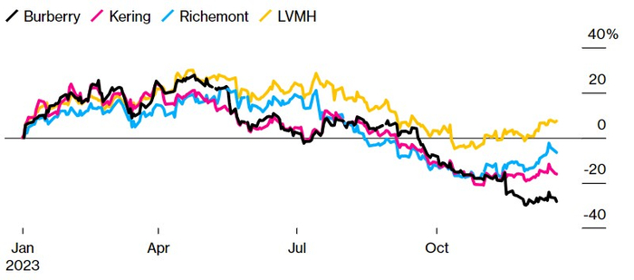 但不同奢侈品公司之间的股价变化幅度相差非常大,比如Gucci母公司开云集团(Kering SA)和奢侈品风衣制造商Burberry的股价跌幅高达两位数,但LV母公司LVMH股价乘着“圣诞大反弹行情”收回下半年的股价失地,截至最新交易日,2023年反而上涨7.5%。该公司明年第一季度的业绩将受到全球投资者密切关注,分析师们则普遍预计2024年奢侈品消费开局将相对疲弱,下半年欧洲央行降息启动后可能将有所复苏。