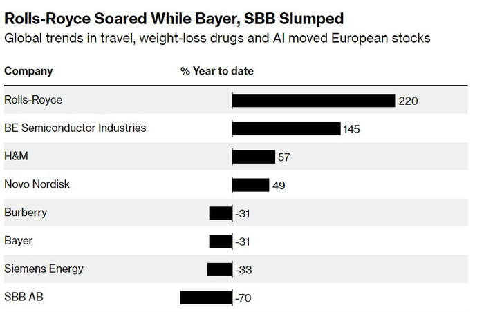 来自Federated Hermes的全球股票高级投资组合经理Lewis Grant表示:“赢家和输家反映的是全球范围的大趋势,而不是当地的宏观事件。”“围绕减肥药的炒作情绪提振了诺和诺德(Novo Nordisk A/S)股价走势,围绕AI的投资狂潮刺激了芯片股,这是一种全球现象,而对经济增长的担忧情绪推动了奢侈品股的萎靡走势。