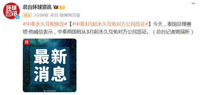 1月2日,泰国总理赛塔·他威信表示,中泰两国将从3月起永久互免对方公民签证。