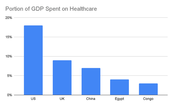 2.世界正变得越来越老、同时也越来越富裕,医疗保健支出占国内生产总值的比例也在不断增加。 富裕的美国是生物科技创新的粮仓,其医疗保健支出占国内生产总值的 17%。其他国家(远远)落在后面,但更好的医疗保健就像抽水马桶和自来水一样,一个国家一旦得到,就不会放弃。例如,中国在 20 世纪 80 年代的医疗开支占国内生产总值的 3%——与刚果现在的情况大致相同——然后在 20 世纪 90 年代占 4%,现在占 7%。