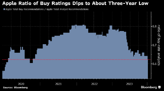 苹果公司已成为华尔街看涨评级最少的大型科技股。对iPhone销售的担忧升温导致该股本周第二次遭遇评级下调,分析师更趋谨慎。