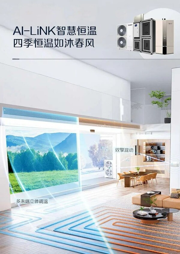 "AI-LiNK高端智慧五恒集成系统"采用了热泵与采暖炉双擎混动,多末端立体调温,即用户可以自由设定家中每个房间的温度,分室精准控温,以充分满足每一位家人的需求。即便是在最寒冷的日子里,该系统也可以创造出足够温暖的空间,并通过净水加湿,将湿度调节至舒适范围。在雨雪天气里,该系统则可以对室外新鲜空气与室内空气进行充分除湿,让"健康好风"遍布家庭每个角落。同时,该系统平台还能够实时、精准地监测室内的二氧化碳、PM2.5、温度、湿度等主要环境指数,从而高效地进行管理与调整。在更舒适、更安静的环境下,每一位家庭成员都将告别不洁空气所带来的憋闷感,全屋空气也将始终保持洁净、新鲜。