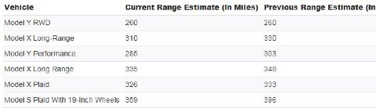 Model X和Model S的订单页面也显示了类似的续航里程估算变化。Model S和Model X不同版本的续航里程减少了至多37英里。