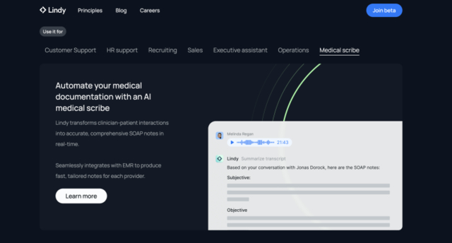 比方说,你可以使用 Lindy 人工智能医疗抄写员自动化你的医疗文档,Lindy 则会将临床医患互动实时转化为准确全面的 SOAP 记录。