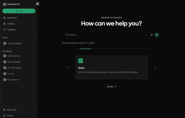 Cognosys 通过生成一组任务来完成目标。它可用于编写代码、创建文件、查找趋势等。它还可用于通过安排助手稍后运行来自动执行重复任务。Cognosys 可以让你帮助你处理繁重的工作,让你花更少的时间在任务上,花更多的时间在重要的事情上。
