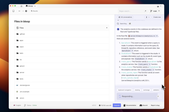 bloop 是一个用 Rust 编写的快速代码搜索引擎。你可以使用自然语言提出问题、搜索代码并使用现有代码库作为上下文生成内容。它的适用对象是开发人员。