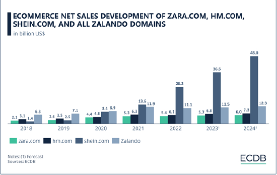 ECDB在去年11月底预计,2024年Shein的网站净销售额可能会达到480亿美元,远远超过Zara、H&M等时尚品