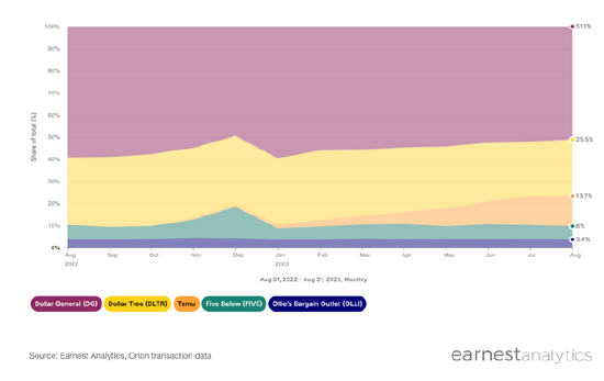 在美国经济前景并不明朗,通货膨胀严重的2023年,Temu的低价小商品无疑直接迎合了美国市场的消费趋势。在Temu杀入美国市场之后,这一领域的两大霸主Dollar General和Dollare Tree,今年的市场份额分别减少了14和4个百分点。