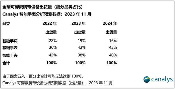 据Canalys,全球可穿戴腕带设备分析预测数据显示,2023年该品类的总销量为1.86亿台,增长2%。而其增长的主要动力是新兴市场(尤其是印度),其基础手表的出货量大幅增长22%。这一增长有效抵消其他两个细分品类的颓势,分别来自智能手表和基础手环9%的下滑。展望未来,可穿戴腕带设备即将迈入更加持续的增长阶段。Canalys预测2024年可穿戴腕带设备的增长率将达到10%。全球对智能手表的兴趣回升推动这一积极趋势,预计其出货量将增长17%。