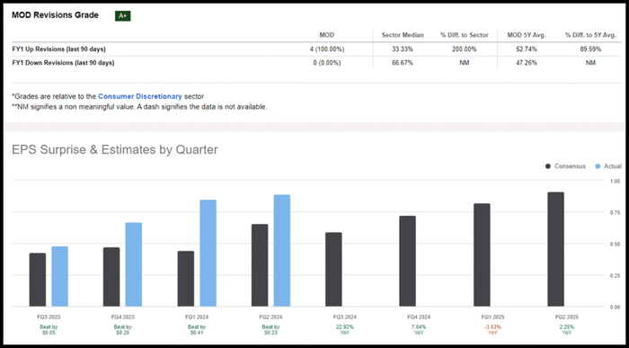 尽管电动汽车已经失去了一些人气,但莫丁制造公司受益于电动汽车趋势,并拥有美国和欧洲最大的市场之一。莫丁制造公司提供商用电动汽车零部件、制冷和原始设备制造商零部件,对开发以电动汽车为重点的细分市场的投资有助于其不断扩大的利润和股价。莫丁制造公司较去年增长195%,盈利大幅超出预期,第三季度EPS为0.89美元,超出预期0.23美元,收入为6.205亿美元,超出预期433万美元。调整后EBITDA为81.2美元,较上年增长59%,EBITDA利润率较2022年第三季度增长13.1%。这些结果促使四位分析师在过去90天内上调了A+修订评级的预估。尽管该股目前交易价格接近52周高点,且鉴于其D+估值评级,其股价相对溢价,但莫丁制造公司的追踪市盈率为15.68倍,与该行业相差14%,其追踪PEG为0.23倍,而该股的追踪PEG为0.23倍。该行业的0.56倍差异超过58%。凭借看涨势头、巨大的增长和盈利能力,可以考虑将莫丁制造公司作为投资组合,但如果以当前价格点进入,则需要谨慎行事。