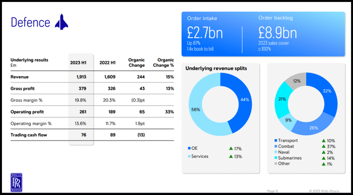 国防是劳斯莱斯的第二大部门,拥有稳定的官方和国防合同收入。订单增加、民用和国防带来的利润率改善以及强劲的财务状况使得国防部门今年上半年增长了87%,订单出货量提高了1.4倍,大量订单积压支持了公司未来的增长。