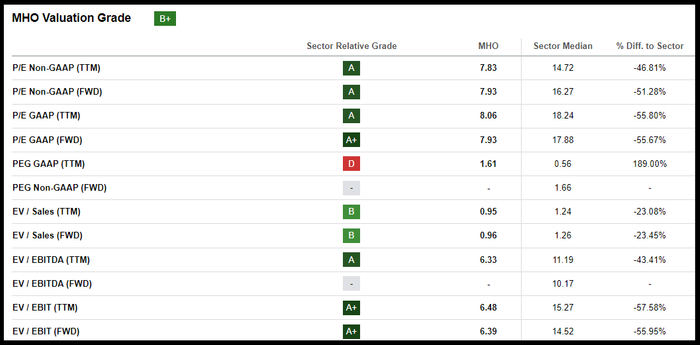 尽管快速变化的房地产市场出现波动,导致许多房屋建筑商业绩下滑,但MHO的股价却在飙升。MHO在美国从事单户住宅的建设和销售,去年股价上涨了198%,交易价格接近52周高点140.73美元。尽管股票飙升,MHO的B+估值等级凸显了其折扣价格,当你将其与库存短缺和住房需求结合起来时,以当前水平购买MHO可能非常有吸引力。