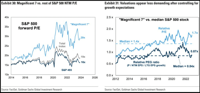 与总指数相比,“Magnificent 7”的估值似乎被严重高估:
