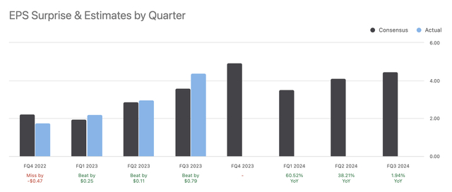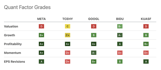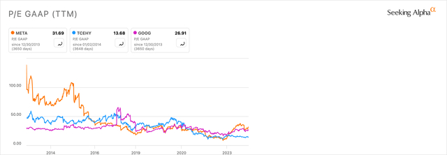 根据量化因子等级,该公司最薄弱的基本面是其估值。其远期市盈率约为24,与谷歌大致相同。然而,有人认为,考虑到其强劲的增长和卓越的盈利能力,该公司的估值是合理的。像Meta这样具有主导地位和盈利能力的组织,其市盈率在20-30之间是合理的,远低于其他科技股,例如特斯拉的市盈率约为78左右,英伟达的市盈率为40左右。与历史相比,Meta目前的市盈率是有利的,进一步证明其以合理的价格出售: