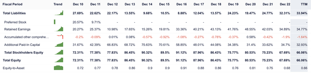 值得考虑的是,该公司的总股本低于历史水平,约为TTM的66%,因此该公司在融资进步和创新方面可能不如预期那么灵活。这也可能引发一些与股票估值相关的担忧。如果资产负债表保持这种状态或变得更糟,那么股票可能会在适当的时候被认为被高估。