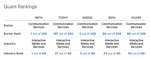 在考虑投资组合分配时,了解公司相对于同行的财务状况至关重要。SA量化排名将Meta评为1(满分245个行业排名),远远优于同行。