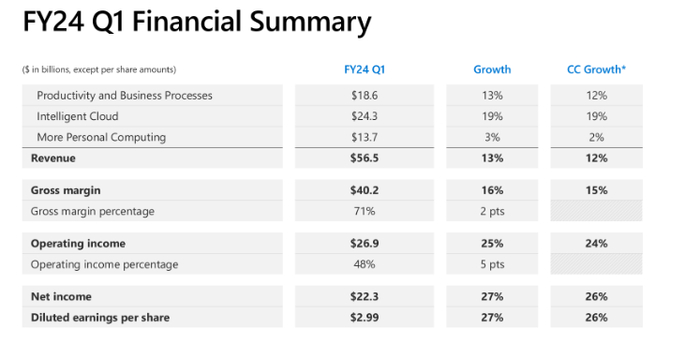 最近一个季度,收入增长强劲,达到13%(按固定汇率计算为12%)。令人印象深刻的是,尽管微软面对严峻的环境,但仍能保持如此强劲的增长率。由于经营杠杆的作用,盈利增长更快,增长了26%至每股2.99美元。