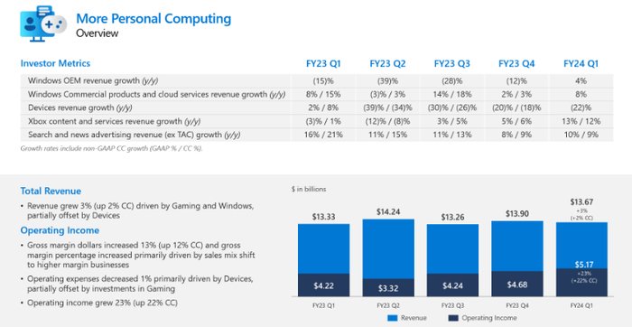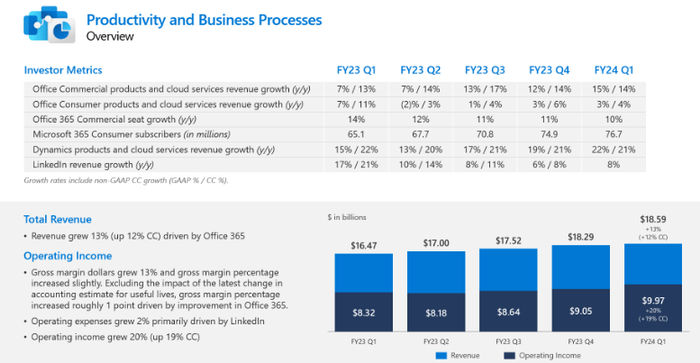 该公司的核心生产力和业务流程部门(包含Microsoft Word等产品)的收入按固定汇率计算增长了14%,高于预期的11%增长。微软在该领域提供了强大的运营杠杆,运营利润率扩大了300个基点,达到惊人的53.6%。