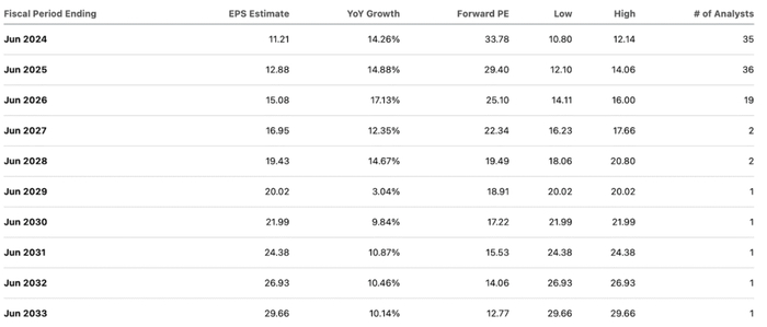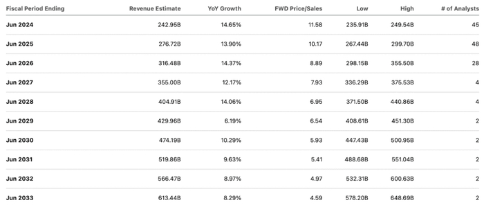 尽管微软今年的全年收入预计将达到惊人的2430亿美元,但预计未来十年收入增长的减速幅度将最小化,共识估计即使不是激进,也是非常全面的。另一方面,如果人们相信该公司能够实现收入目标,那么盈利预测可能会显得保守,因为共识预测仅考虑到2033年净利润率仅增长170个基点,达到35.9%。