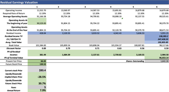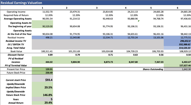 与前一个模型相比,该模型显示出更为乐观的结果,将合理价格确定为120.91美元,较当前93.4美元的股价上涨29.5%。此外,该模型表明,到2028年,该股票的定价应为230.49美元,相当于年回报率为29.4%。