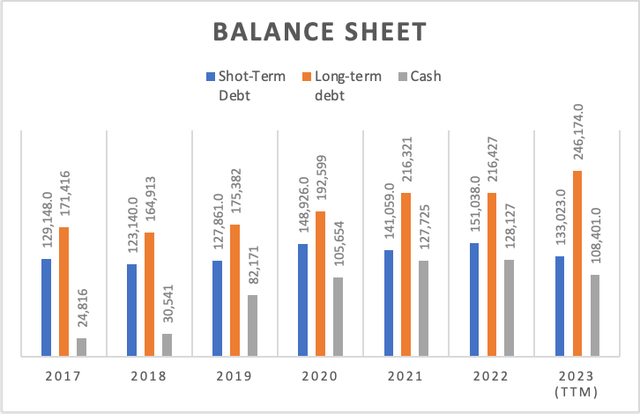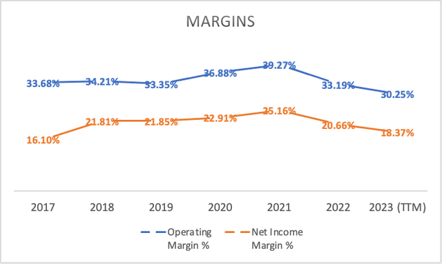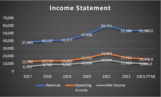 对于摩根士丹利的初步分析,我将主要依靠分析师的估计。在收入方面,分析师预计2023年为541.4亿美元,2024年为564亿美元。在净利润方面,分析师预计2023年每股收益为5.58美元,2024年为6.55美元。这些数字乘以流通股并根据摩根士丹利的税率进行调整后,产生营业收入115亿美元和135亿美元。