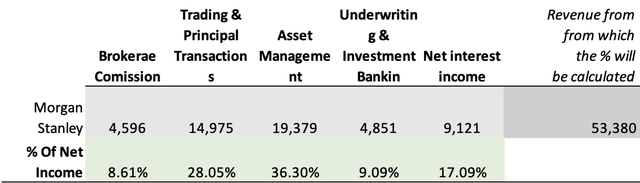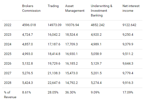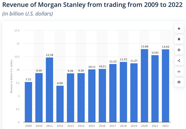 对摩根士丹利来说,预测更具挑战性的方面之一是交易收入,该收入以其固有的波动性而闻名。如下图所示,从2009年到2022年,交易收入的年增长率为7.14%。该增长率将用于预测2024年至2028年期间的交易收入。
