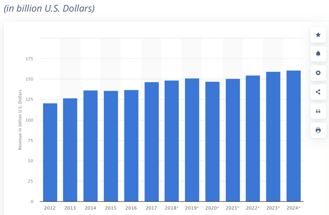 预计2024年美国证券经纪市场的收入将达到1608.4亿美元。与2012年1203.8亿美元的收入相比,我们可以看到市场收入的增长率为2.8%。
