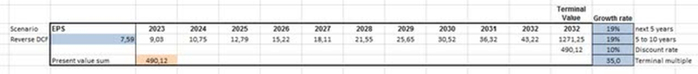 然后我们得到的结果是,该股票当前的价格意味着未来 10 年 EPS 增长率为 19%。英伟达的 3 年复合增长率:70.49%、5 年复合增长率:32.33% 和10 年复合增长率:44.34%都远高于此。这再次表明该股票并未被高估,甚至可能恰恰相反。