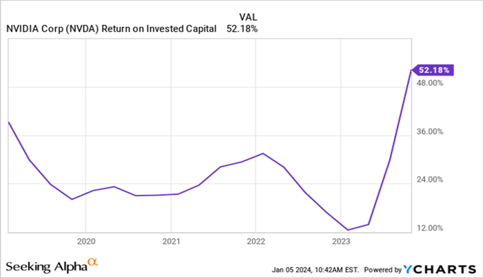 英伟达过去 5 年的最低 ROIC 刚刚超过 12%,平均接近 22%+。根据我的计算,通过 5% 的债务成本和 9.3% 的股权成本,WACC 约为 9%。因此,英伟达目前的 ROIC - WACC 差值为 52% -9% = 43%。对于一家发展如此迅速、产生正自由现金流且没有过度杠杆化的公司来说,利差令人难以置信。