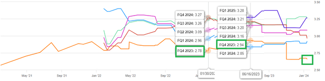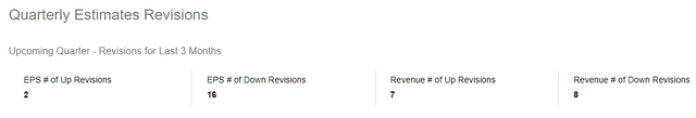 美国运通第四季度的每股收益预估已从年初的2.78美元升至6月份的2.94美元,再到目前的2.66美元。另外值得注意的是,自2023年10月以来,Q4的EPS预期下降了近8%。此外,在过去3个月中,只有2/18的EPS修正向上,而7/15的收入修正向上。这表明人们对公司收入潜力的信心比对利润潜力的信心更强。