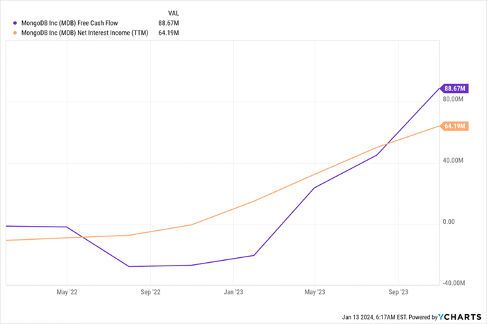 有趣的是,MongoDB持续盈利的领域是其14亿美元投资于有价证券(很可能是短期国债或货币市场基金)所赚取的利息。考虑到利率上升是导致2022年成长型股票大屠杀的最重要原因,这相当讽刺,但现在实际上让MongoDB能够可靠地获得相当不错的回报:在考虑到其小额债务义务后,在过去12个月中该公司从投资利息中赚取了6400万美元,这一数额与其实际自由现金流相当,但可以说甚至更好,因为它更可靠和可预测。