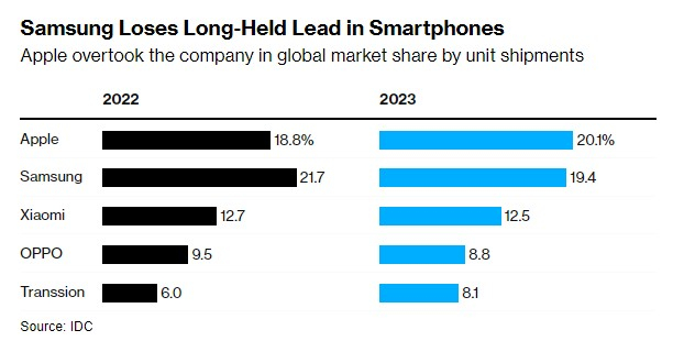 根据最新数据显示,苹果(AAPL.US)首次超越三星电子(SSNLF.US),成为全球智能手机市场的领头羊,这也是三星自2010年以来首次失去榜首的位置。