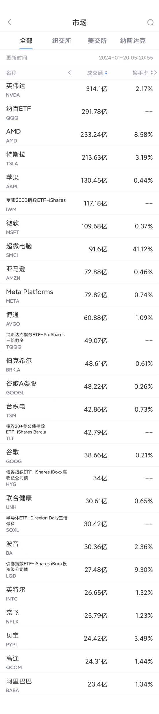1月19日美股成交额前20:英伟达与AMD均创新高,投行上调多家芯片股目标价