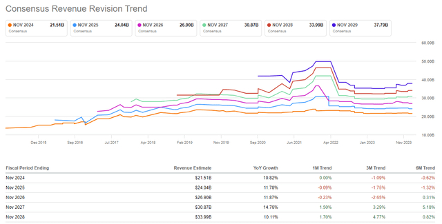 Adobe 的战略定位是确保 2024 年及以后创意工作流程蓬勃发展的市场需求的很大一部分。分析师普遍预计,未来 5 年营收复合年增长率将达到 10% 左右,在我看来,这虽然雄心勃勃,但却为 Adobe 的增长轨迹提供了一个可行的目标。