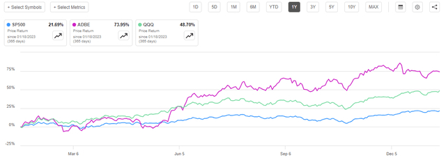 Adobe在 2023 年的表现明显优于大盘股票市场。在过去 12 个月中,Adobe 股价上涨了约 74%,而标准普尔 500 指数的涨幅约为 22%,而以科技股为主的纳斯达克 100 指数的涨幅接近 49% 。